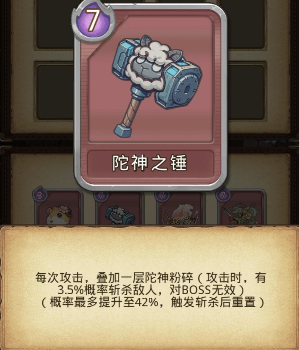 某吧,某站,tap搜了一圈,找不到一个介绍世界之子的(悲)于是自己双大地爬了一下,留给自己以后需要看的时候用1.陀神之锤:7级3.5%*12=42%概率斩杀小怪2.墨镜兔:7级14%概率不消耗卷轴,序列由释放魔法推动(无法伤改和下楼改)3.小可怜:3级延长沙漏三回合4.爆炸小屋:7级63%翻开地板5.梅妮莎:7级死亡回复35%生命,每10层生效一次6.小白白:7级增加7%闪避上限7.