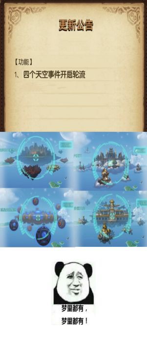 各位大佬:最近大家的催更我们都看到了,很抱歉让大家等了这么久。(ㄒoㄒ)为了让大家安心,我来搬运下放牛娃前天在公众号上面发的版本内容爆料~希望能够解答大家现在的一些疑问。另外,欢迎大家关注我们的微信公众号:busiyimigong~——————————以下是严肃的内容爆料——————————1、关于“天空轮换” 最近大家吐槽最多的“大型天空事件”轮播开放的问题,虽然由此引出了很多表情包