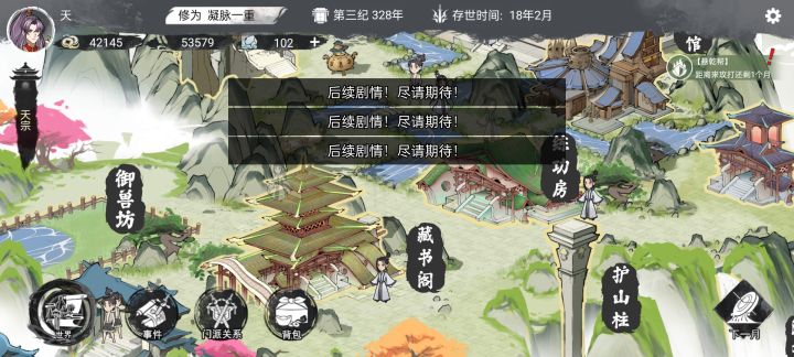既然都修仙了,是不是组织下天梯赛之类的,灵矿占领了应该长期的啊,可以设置成大家互抢。建议增加一个秘境,3年或者5年开启一次,需要各大宗门选出多少个弟子进入,然后有争夺,陨落啥的,宗门因此结仇,或者在秘境里救了谁,和对方宗门结亲之类的,进秘境收服神兽仙兽(就几只),或者直接就是神兽蛋,然后出秘境需要孵化6个月1年之类的,期间别的宗门可以抢,我感觉这才是仙侠世界。还有各个城池的物资卖的太贵了,没啥性价比,洞天派帮主出去就行了,搞一堆东西回来,还没啥损失。嫁女儿那个,就提示了个文字,去了城池啥都没有,我感觉在前面可以搞个比武招亲啥的,后面大宴宾客之类的,做点场景会不会更好些,哈哈,游戏结束的太仓促了,才18年2个月就结束了,18年在别的修仙小说里面,可能都还没开始修炼呢,你这就结束了???关键最后说我调戏他掌上明珠,我都没见过长啥样,太冤枉了😂😂😂