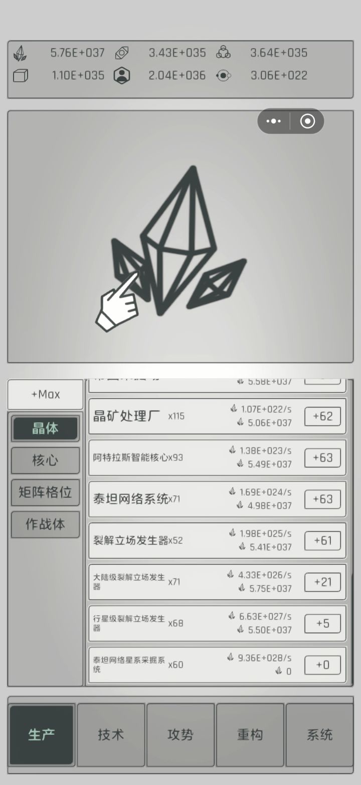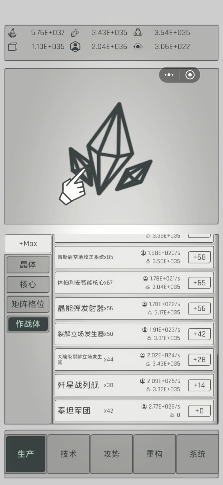 新版本修改内容:调整了大部分的数值设定。 “生产”功能: 增加了每个单位的升级所需的资源数量。 减少了每个单位的资源产值。 “技术”功能: 减少了所有的加成效果。 提高了升所有升级需要的资源数量。 “重构”功能: 修改了“质能”的加成算法,现在不会出现过于爆炸的加成数字了。(第一次重构的加成约在50%左右,多次重构会维持在个位数的倍数加成内) 限制了重构次数上限,上限为6次。