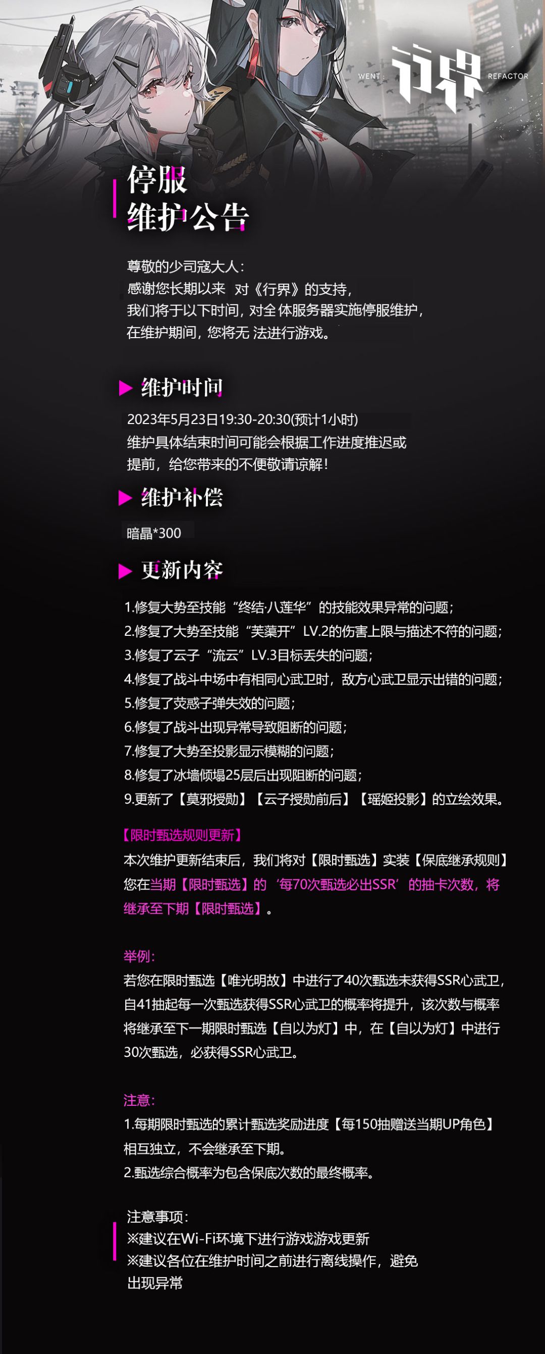 尊敬的少司寇大人: 感谢您长期以来对《行界》的支持,我们将于以下时间,对全体服务器实施停服维护 在维护期间,您将无法进行游戏。 =维护时间= 2023年05月23日19:30~20:30(预计60分钟) 维护具体结束时间可能会根据工作进度推迟或提前,给您带来的不便敬请谅解! =维护补偿= 暗晶*300,维护结束后将发放至各位邮箱,请及时领取。
