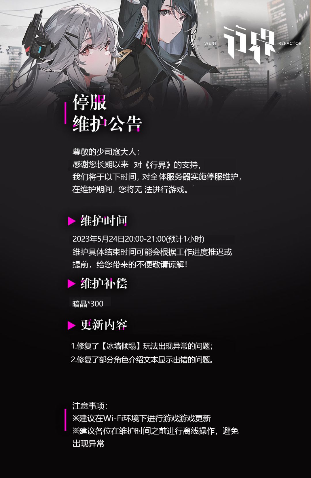 尊敬的少司寇大人: 感谢您长期以来对《行界》的支持,我们将于以下时间,对全体服务器实施停服维护 在维护期间,您将无法进行游戏。 =维护时间= 2023年05月24日20:00~21:00(预计60分钟) 维护具体结束时间可能会根据工作进度推迟或提前,给您带来的不便敬请谅解! =维护补偿= 暗晶*300,维护结束后将发放至各位邮箱,请及时领取。