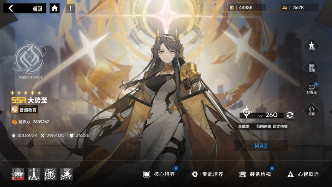 她的三个技能都很肉,不会突然暴毙,有闪避,带控制,能自己回血,开了定制后还有辅助功能。阵营也是绿色的十洲,和僵尸、云子、大月卡的瑶姬、老头能搭配,绿色是回能,基本都能用到,0-3星提升不明显,低星能用。搭配固垒装备,简直不要太逆天的坦度。120级可抗所有装备本。到后面第六章深度模式,把她升到160或者161级,龙象抗完后她接着能顶很久。 (我现在养她到160级,活动本极难本已过。极难本boss关
