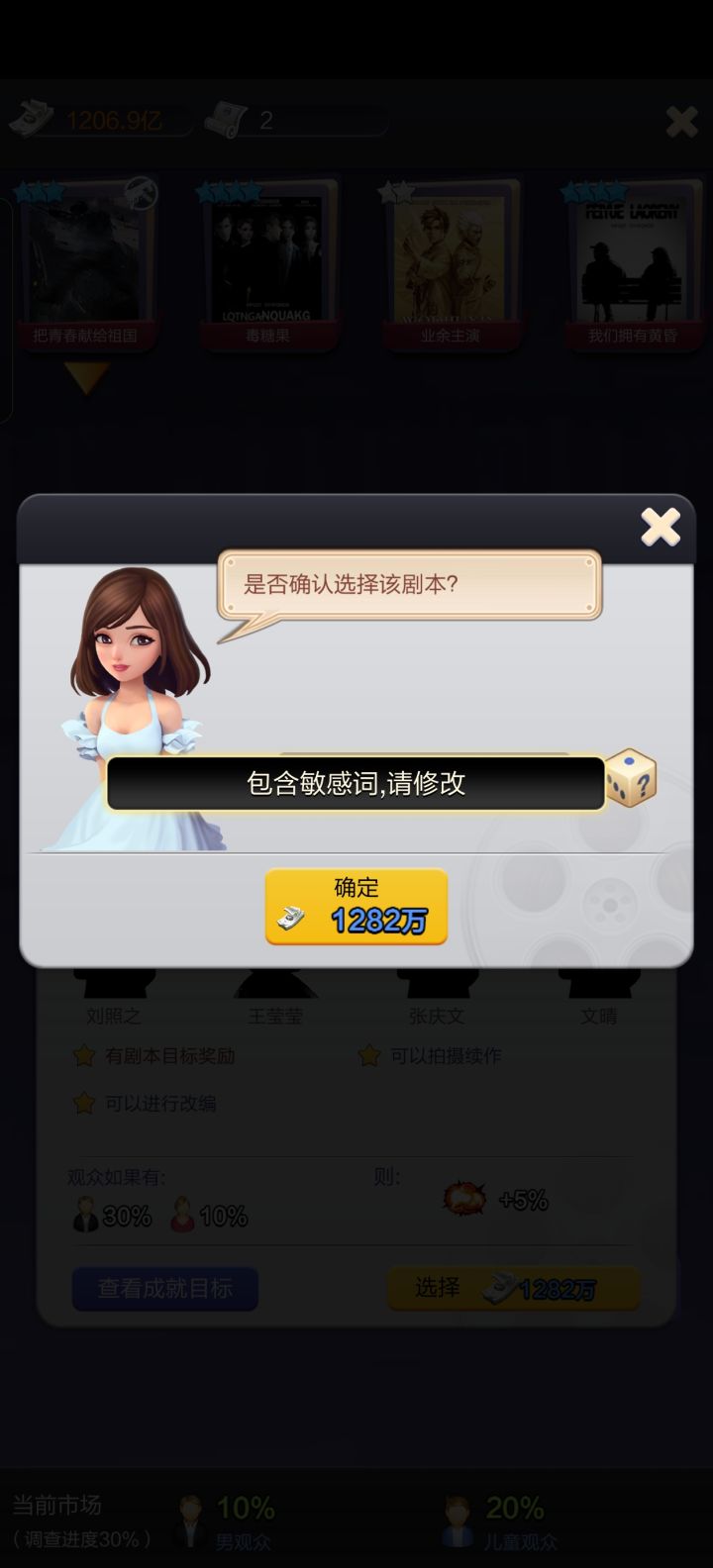 第一个艺人免费4星建议欧美女,便于尽快凑欧美全明星阵容。前几部记住把艺人等级拉起来。第五部电影后,会开启剧本库。拍摄剧本选择:第一优先人多,第二优先星级高,第三初期躲日韩本。单个艺人强度排序,六星(隐藏10%总票房)>限定五星(隐藏5%总票)>普通五星>四星。艺人组合可能有票房技能,以后你会知道的。拍完后有期待值问题,记住街区1可以无视期待值,票房玄学。街2至少拉到200期待。街7以上尽量