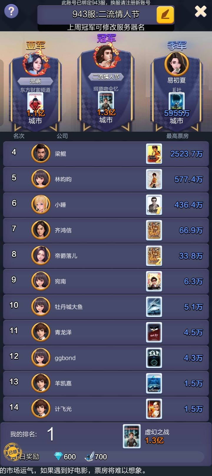 我的号不能正常显示在首位票房,区服亚军却在显示!ID:2152457.