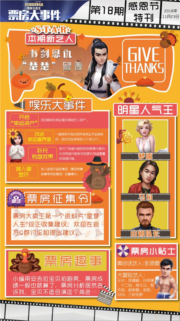 各位票房大卖王的导演大大们 ,你们好吖!又到了每周大事件的时间咯,时间过的真快,2018年已经快要接近尾声了呢。票房大卖王提前祝大家2019年快乐哟!又到了每周大事件的时间了呢。细心的观众盆友们应该注意到了呢,我们更新了游戏场景,飘雪的大卖王是不是更好看了呢。本周我们还更新了很多游戏的细节,还推出了一位新艺人!!!——XXX接下来就是我们的本周大事件了,红红火火恍恍惚惚……大家请看!本