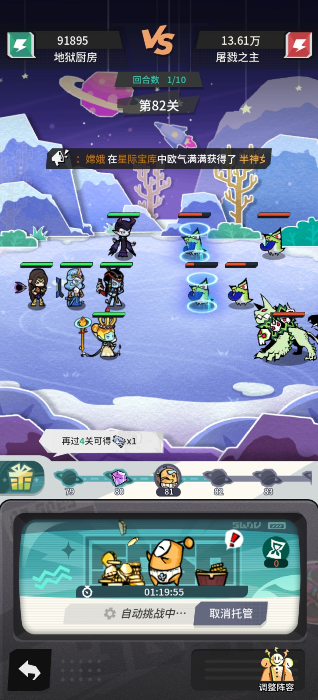 任务看图一,优先主线加支线做任务,地图里的怪和能搜查的一些东西一个也不要放过 角色推荐 输出:海神、战争机器、半神女侠、蓝精灵(单体伤害)、小丑女(限定抽)、关二爷(充钱买),推荐半神女侠加蓝精灵两个输出,或者再加一个居里夫人,有小丑女换蓝精灵 回血:赫拉、盖亚 控制:琳娜贝尔、伊丽莎白 增益:幽冥女巫(加伤害)、香奈儿(加防御) 整容搭配:半神女侠、小丑女、赫拉、琳娜贝尔、(幽冥女巫、香奈儿看推