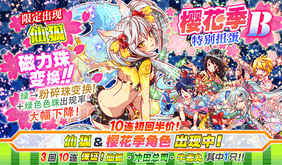 【樱花季・B】扭蛋开启中!来艾丽丝一起赏樱花吧~!赏花季限定仙狐等角色出现中!!【开启时间】2018年4月3日下午3时~2018年4月10日下午3时【特选角色】【蛋池概率】扭蛋所得角色均为叠加值5。10连抽必定出现★5角色一只!3回10连保证获得仙狐、冲田总司、牛若丸其中1只!