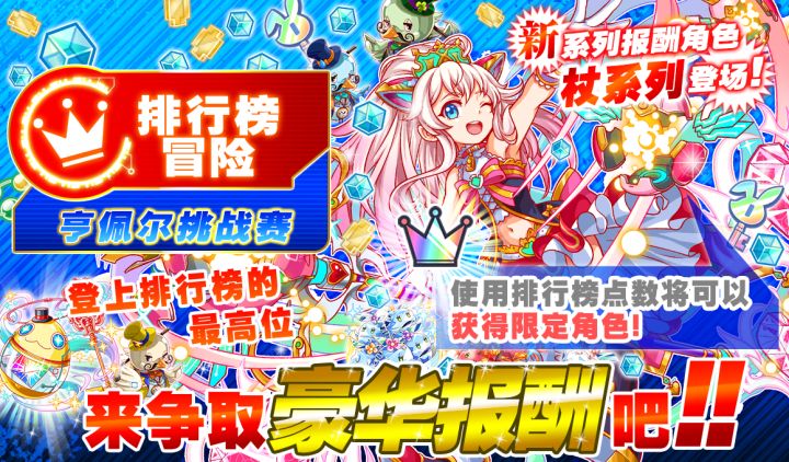 这次的排行榜冒险是“亨佩尔挑战赛”!就如同这次冒险标题一般,在最后阶层将会有着某个强力角色正等着玩家们的挑战!大家来挑战高分,向排行榜的顶点迈进吧!■举办时间・准备时间:11月6日 15:00 ~ 11月7日 15:00・挑战时间:11月7日 15:00 ~ 11月13日 15:00・查看时间:11月13日 15:00 ~ 11月16日 15:00■冒险排行榜简单说明冒险排行榜是一