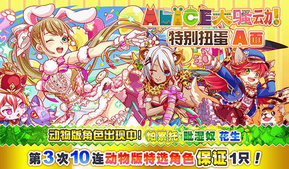 【艾丽丝大骚动・动物朋友】扭蛋A面登场!动物版限定角色 帕累托 毗湿奴 华生 将在活动期间登场!第3次10连抽必定获得动物版角色 帕累托 毗湿奴 华生 其中1只!【开启时间】2018年10月5日15时~2018年10月16日15时【特选角色】【蛋池概率】※请参见游戏内公告[table] 首次抽取半价![/table] 扭蛋所得角色均为叠加值5;第3次10连抽保证动物版角色 一只!