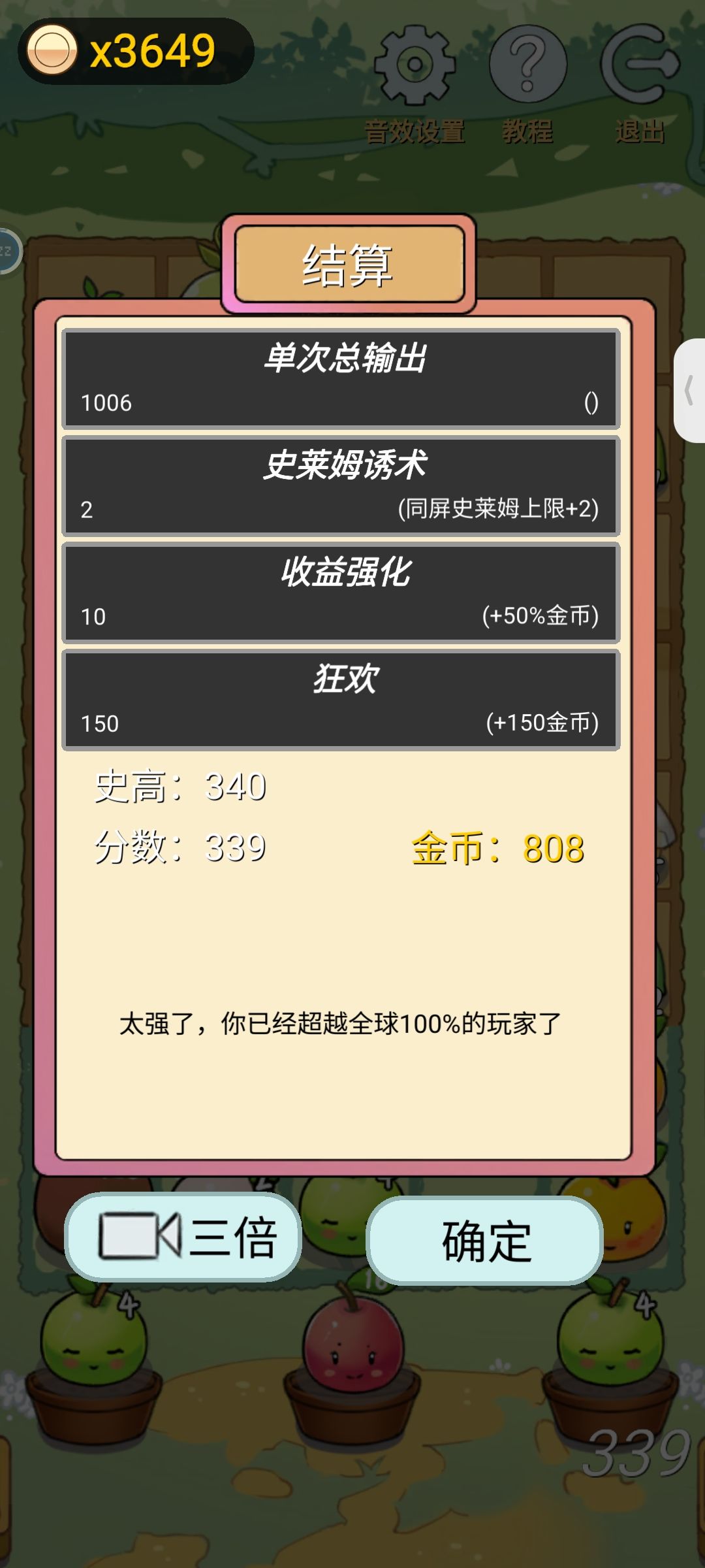 玩了几天来看,这是一款挺不错的休闲类的游戏,但可惜的是可持续性比较低,望后续官方可以增加一些比较不一样的模式吧,比如加一些道具,或者残局破解闯关之类的模式 总结一下经验吧,在游戏过程中不要急着合成更高的植物,要平均合上去,合到64就可以停了,把上排4个格子都是64的,中间那格子可以是16或者8的都可以(因为中间的史莱姆出现的都是横跨两格的大史莱姆,所以需要的防守力比较小),然后下面那排也要保持至少