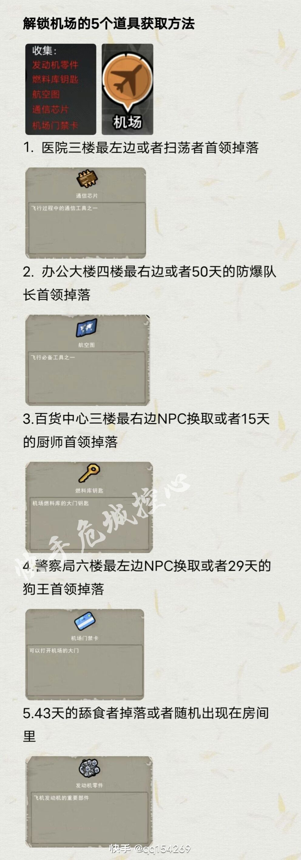 航线图:办公楼4层右边,好像有个胖子NPC在二楼 芯片:医院三楼左边,有个妹子NPC在五楼右边(或者四楼),手上拿把黑剑,会掉军用匕首 门禁:警察局6层左边有个拿枪的小偷,狼牙棒换,或者弄死 钥匙:百货三楼右边npc10个子弹换,或者直接弄死 发动机零件:只能等40天的BOSS