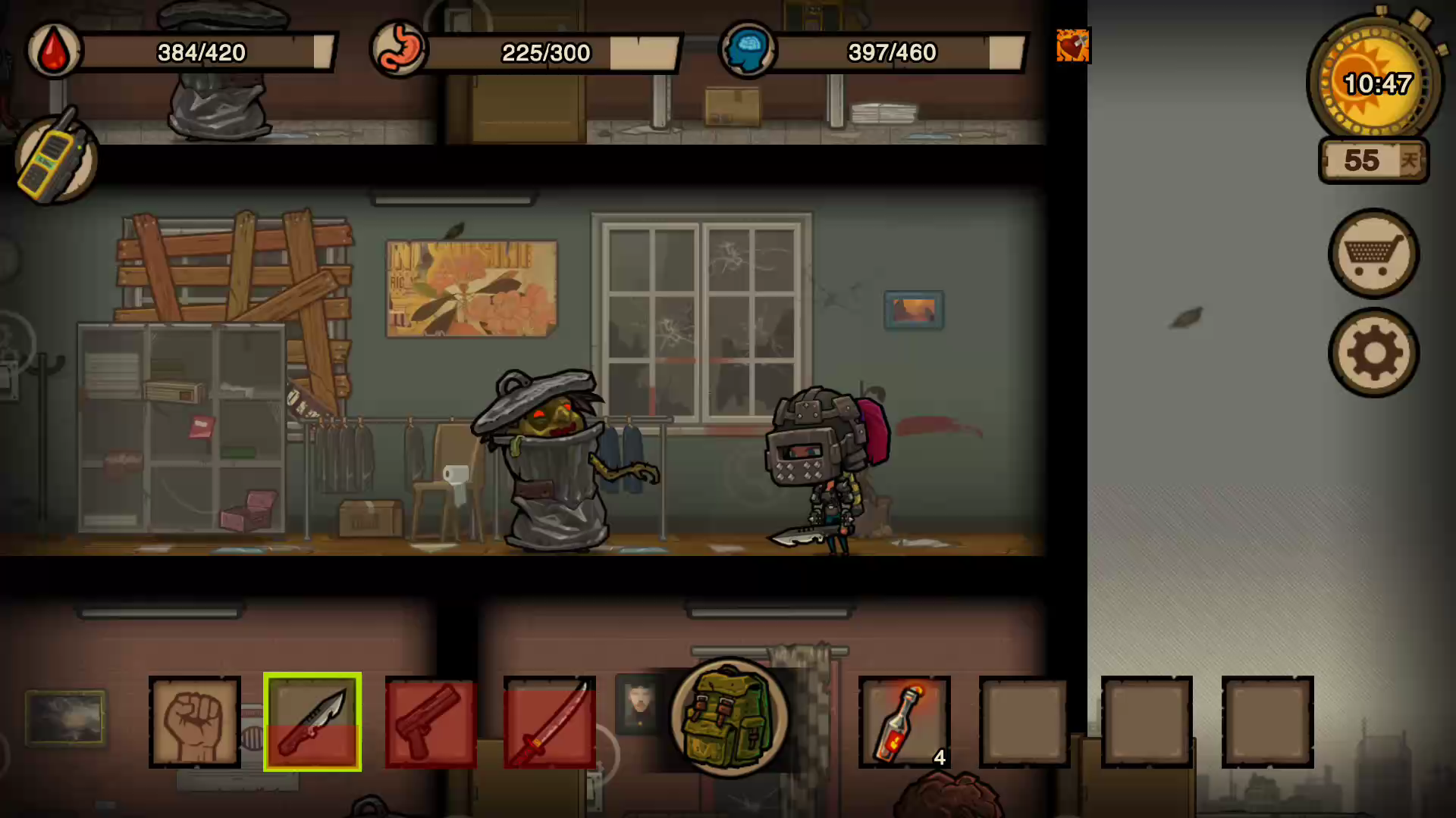 拾荒者是可以无伤过的,大妈可以只掉一次血!狼狗有点难!再碰到boss给各位看看怎么过!金属有点缺,近战武器不要做!子弹也少来点!能偷家就偷家!不战而屈人之兵最好!木头开局不用带,我多的用不完!前三天找个时间去警局,办公楼,这种地方浪!