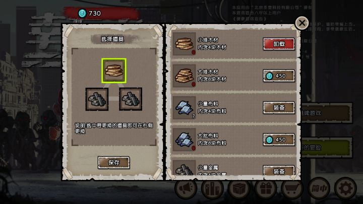 《幸存者:危城》是一款国产Roguelike生存游戏,如果你喜欢《活下去》、《归家异途》这一类型,那也一定能轻松上手本作。游戏设定在一个僵尸横行的末日世界,玩家要独自一人外出冒险,击败僵尸,收集素材,打造武器和生存物品,尽可能地活下去。角色有着血量、饥饿度和精神状态3个属性,相互影响且须要休息、饮食来补充。点击僵尸就能自动攻击,玩家在前期只能靠木棍、小刀等破烂来杀敌,随着工作台的升级,他能制作