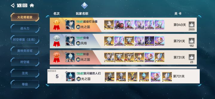 前期前期攻略没什么变化,心愿指定贝利亚拖雷基亚,这两个都是超限5完全体,爬火花塔前期用到后期,角色非常保值现在主流是2个流派,没有反制手段,遇到就拼练度,同练度杰顿胜率高一些光之国多宇宙敏捷爆发流(捷德终结,艾克斯,布莱泽,特利伽,究极赛罗,钢然捷德/泽塔)(赛罗钢燃捷德刚需专武,特力伽最低要求是超限1)这个阵容适合氪佬,目前整个游戏最强的大象就是使用这套阵容,压制力无敌宇宙人怪兽杰顿封