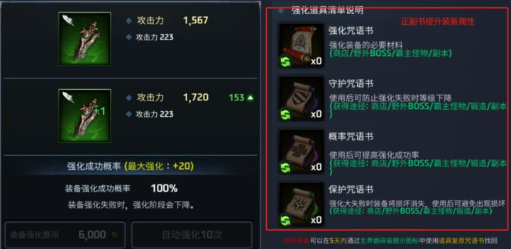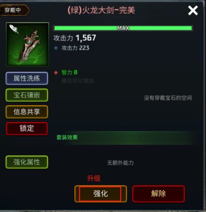 1、升级① 从包里选择需要升级的装备后,点击【升级】按钮。② 选择升级所需的材料材料等级越高,升级经验值越高。※作为材料使用的装备一旦使用就无法恢复。2、升阶装备达到最高等级后即可升阶。(装备升阶需要升阶石根据装备会自动选择升阶石)※如果没有所需的升级石,则无法升级装备。※ 使用5个低等级的升级石可以合成1个高等级的升级石。升级装备时会根据概率添加额外的属性如果你想增加概率,请