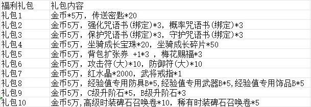 公测啦~公测啦~公测啦~最新的cdk出炉,请笑纳~~~礼包码vip111:金币*5万,传送密匙*20vip222:金币5万,强化咒语书(绑定)*3,概率咒语书(绑定)*3vip333:金币5万,保护咒语书(绑定)*3,守护咒语书(绑定)*3vip444:金币5万,坐骑成长宝珠*20,坐骑成长碎片*50vip555:金币5万,背包扩张券 +1*3 ,梅花赐福*3vip666:金币5万
