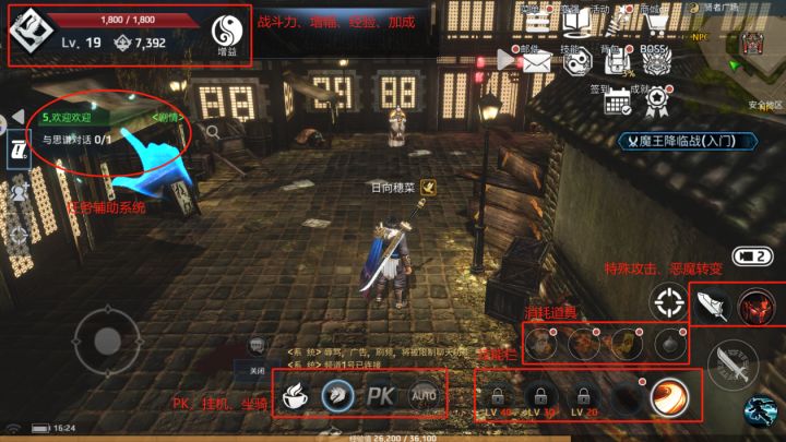 ① 进入游戏之后系统会引导并且左上角拥有一个自动化的任务系统带你了解四神世界。② 左上角可查看自己的角色等级以及战斗力。 boff 可查看角色的增益(攻击力、经验值加 成)还可查看队伍情况。③ 正下方可选择乘骑模式、 PK模式、和平挂机模式。和经验条和聊天系统。④ 右下角是攻击技能、和已经装备的消耗品:⑤ 特殊攻击:利用角色特有的能力进行攻击。⑥ 恶魔转变:您可以收集恶魔转变量表并在一定
