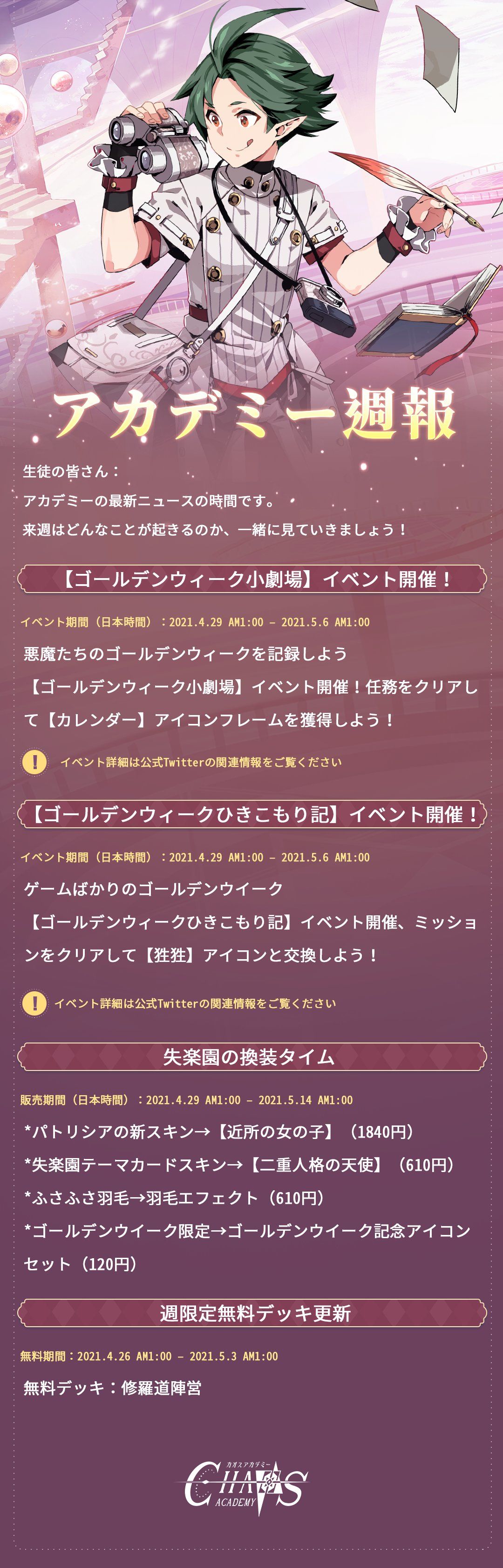上推特看了一下,官方的周报好像没有在推特以外的地方发,而周报是下周活动的大概预告,虽然详细的也基本会当天发一次,但看了也不亏,所以来机翻部分搬运了,希望能有大佬纠正机翻错误! 顺带等一下看看官方能不能发中文版的…… 【黄金周小剧场】 活动时间:2021.4.29零点-2021.5.6零点 恶魔们的黄金周日常记录 【黄金周小剧场】活动期间,完成任务可获得[日历]头像框 【黄金周的家里蹲日记】 活动时