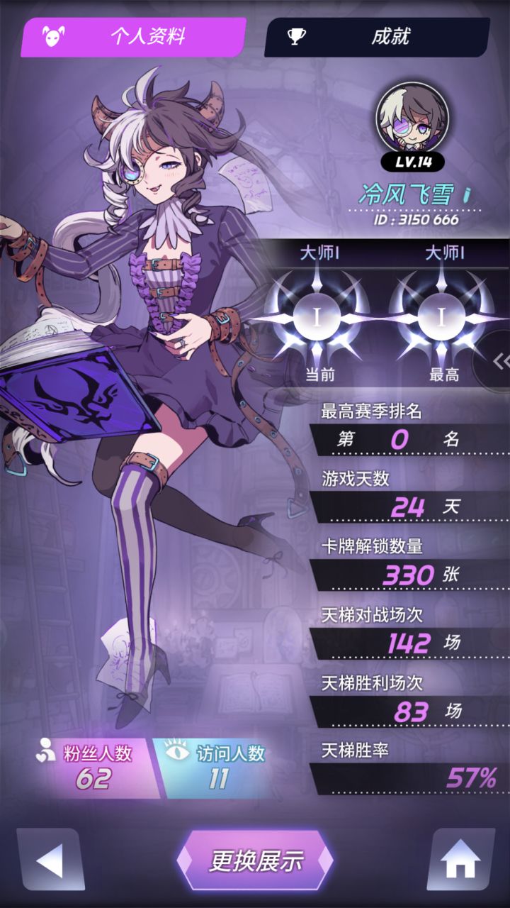 日服玩家,目前日服教授3最高教授1(因为懒了几天水平下滑给日服大师愉快送走了)(我也想为国争光杀穿日服的,可事我没有钱),段位分:见习,初级,中级,高级,博士,教授,大师,大师前有小段,大师后看有几颗星。毕竟国服要开了,在日服挨毒打的我自然想回国服称王称霸(bushi)。本游戏有抽卡集卡元素,还分为b卡(绿),n卡(白),r卡(蓝),sr卡(紫),ssr卡(金色传说)的区分,其中b卡白送,抽卡一