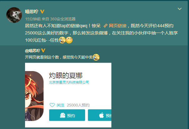 今天官微发送了一条微博被抓住了233那么就特此来做个声明吧。官方微博:灼眼的夏娜手游(加蓝v认证的!)官服娘微博:喵思咛(加黄v认证的!)关注官方微博,暂定送1张现世祈愿卷吧(出稀有宝具的几率大),关注官服娘微博,暂定就再送一张红世祈愿卷吧(出稀有协力者的几率大,也就是传说中的ssr)。动动手指233两张券到手!不要怀疑自己欧洲人的血统啊!两张券说不定你就带着夏娜走上了战力榜的巅峰!(