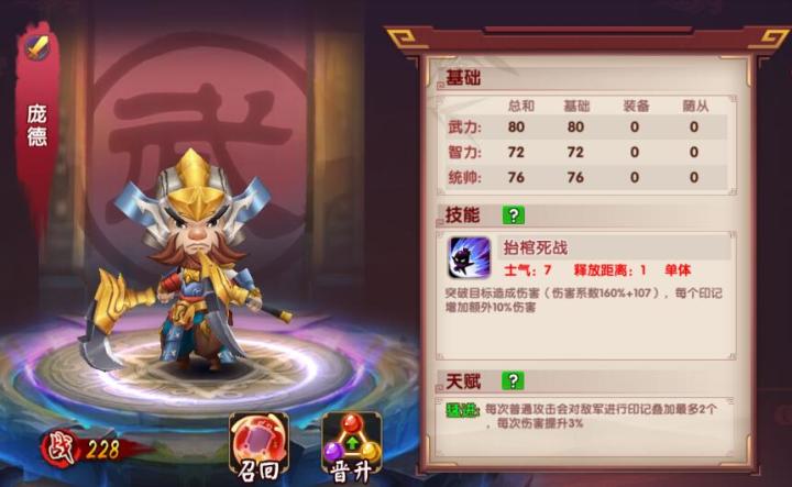 颜良,字文恒。袁绍帐下,一员勇将,史称上将颜良。在讨伐公孙瓒中立下赫赫战功,但谋略稍差,是员虎将而非帅才。在袁贵与曹老板的决战中,被关羽比喻为插标卖首之辈,后被关羽斩杀。我们根据三国演义中颜良特点,定制其属性、技能和天赋如下图所示:技能上将先锋:颜良以勇著称,在战场上攻击时用力很猛,容易眩晕控制对手1回合。天赋骁勇:普攻时可以击倒对手,被击倒的对像不仅受控一回合,而且其他物理输出在攻击该对像