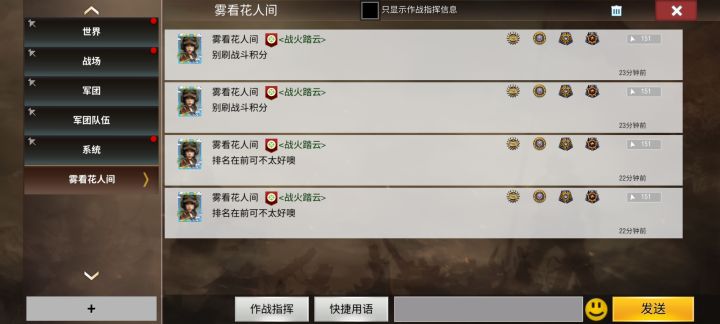 好久没玩二战,tap上最开始的号还在,上来玩了一局。没啥资源去刷点兵搞点石油,哦哟还被威胁了,还是这种阴阳怪气的方式。以前玩的时候还是大团霸图,人家嘴炮是有实力,大团,策略团凌晨3点开始扫图,晚上不开保护不敢睡觉。这位就纯来搞笑的,缺少武德,只会嘴炮,如果一边嘴炮一边把虎王摆我家门口,才能让我有点怀旧感。