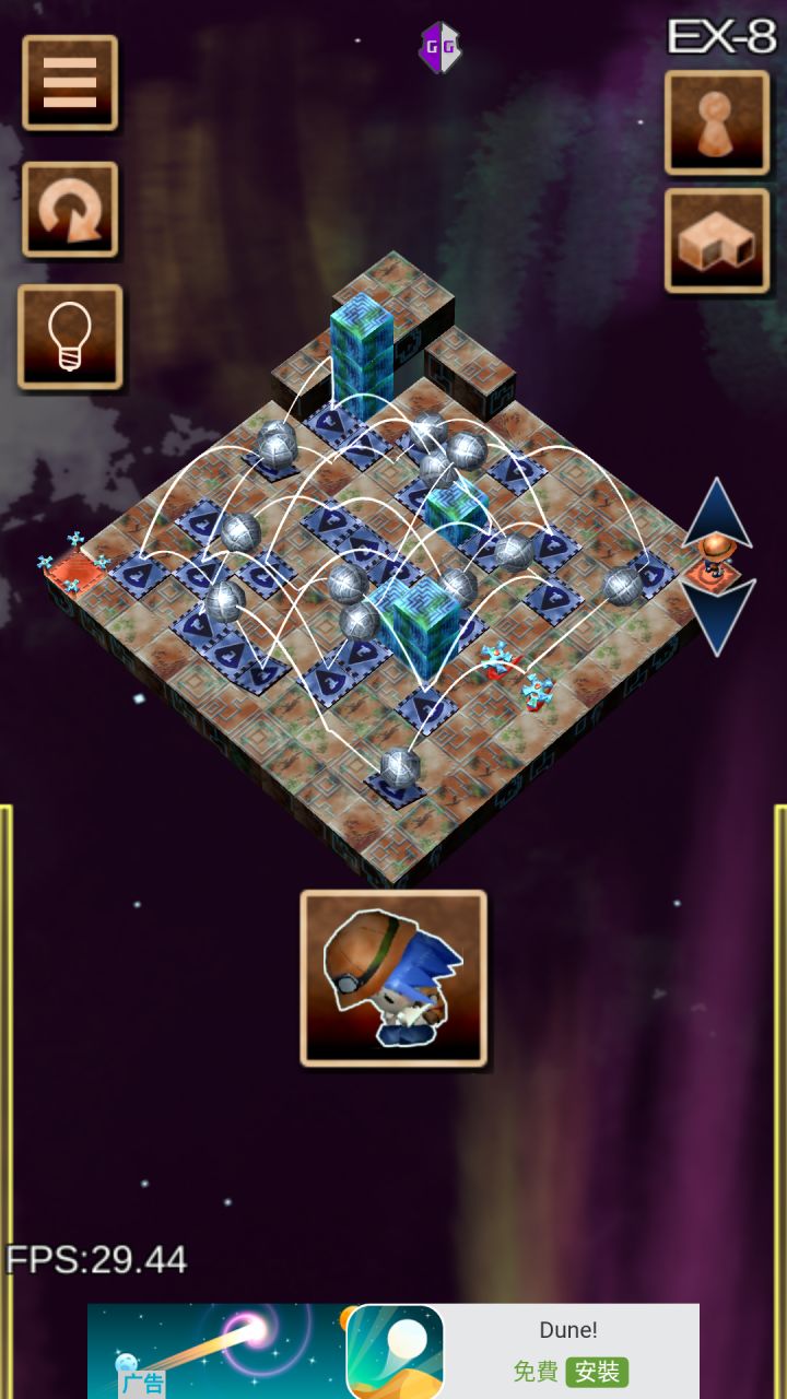 这关要从结尾开始向前推理,能弹到发射口的弹板只有一个,设为A同时,能弹到A的只有B,以此类推,最后就只有一条路线剩下的就是搬运石头了