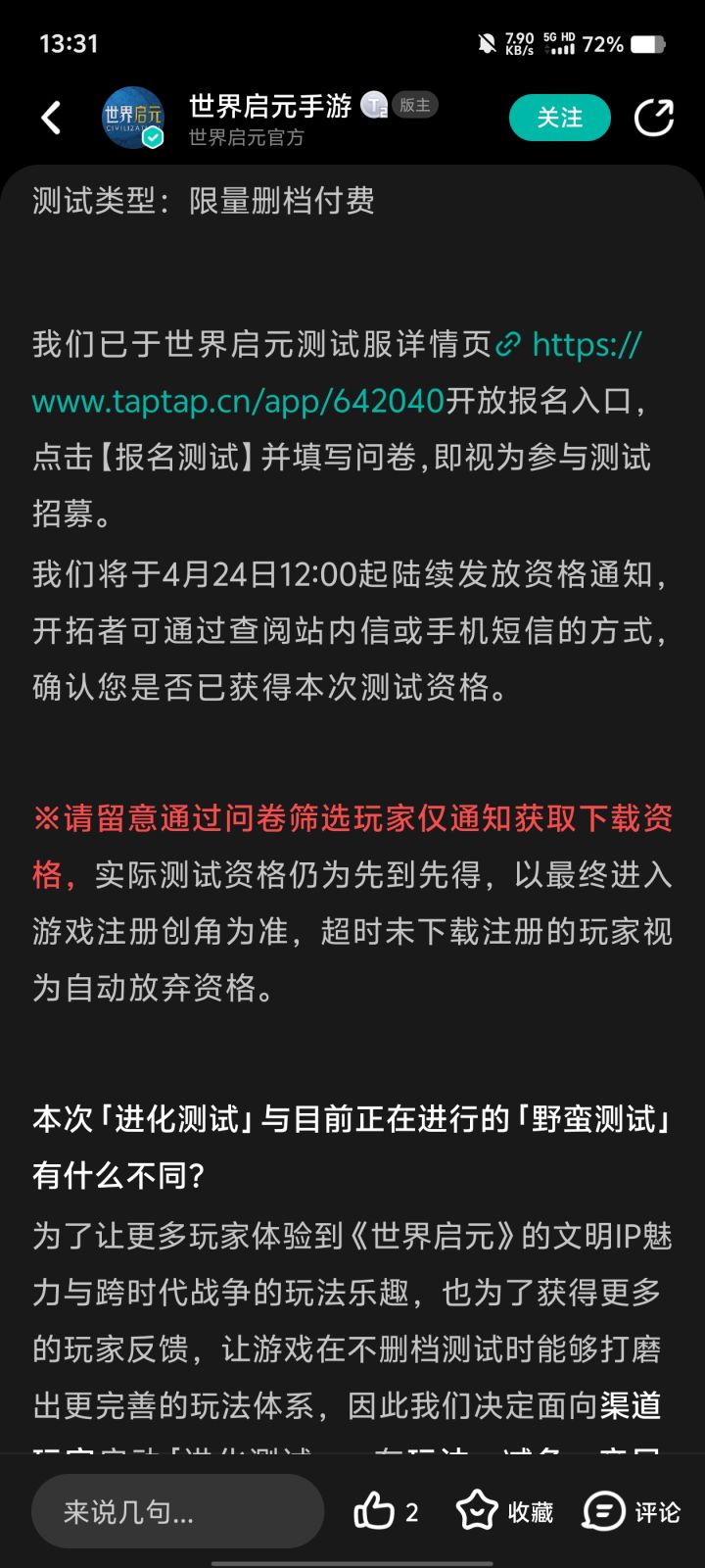 各位开拓者们,《世界启元》「进化测试」将于4月25日正式开测!欢迎大家登录《世界启元》,体验文明成长与科技发展的魅力。在体验游戏的途中,您遇到的任何问题都可以在本贴下方的评论区进行留言。包括您在游戏过程中遇到的问题及建议反馈。【反馈方式】今日起,开拓者可以在本帖内发表对于「进化测试」游戏内容的反馈意见。为了方便项目组收集整理开拓者的具体反馈,请各位开拓者单独留言或评论~请勿在楼中楼内留言