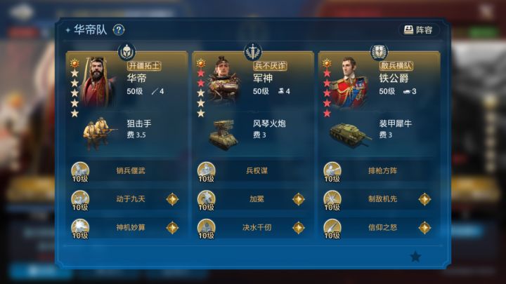 最近在世界上看到大神玩家分享了一套黑科技阵容,智力系控制普攻流,阵容由华帝、军神和铁公爵构成,算是华帝体系的一个变种。这套阵容的核心思路就是主打一个朴实无华的暴力。在动于九天+决水千仞+铁公爵自带技能的排枪方阵的友方增伤或敌方降防的buff下,华帝的上控制,同时自己高额造伤;军神自带技能有控制易伤,靠加冕+风琴火炮+信仰之怒的三次溅射普攻打出aoe伤害。同时,该有的控制也都有。那么再详细拆解一