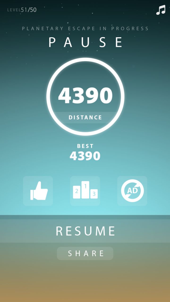 “容易学习,难于操作”是 AppStore 给《Force Escape》的一句话介绍,游戏的主界面似乎暗示了游戏的背景,一片废墟。此时世界应该已经只剩下一片虚无,那么我们保护在身后的,就把它当做“希望”吧。在《Force Escape》中,我们将作为“希望”的守护者,把它带离这已经坍塌的世界,“希望”勇往直前,我们则在它身前它披荆斩棘。逃生力场,逃离的就是这带有重力的地球。游戏有50种障碍挑