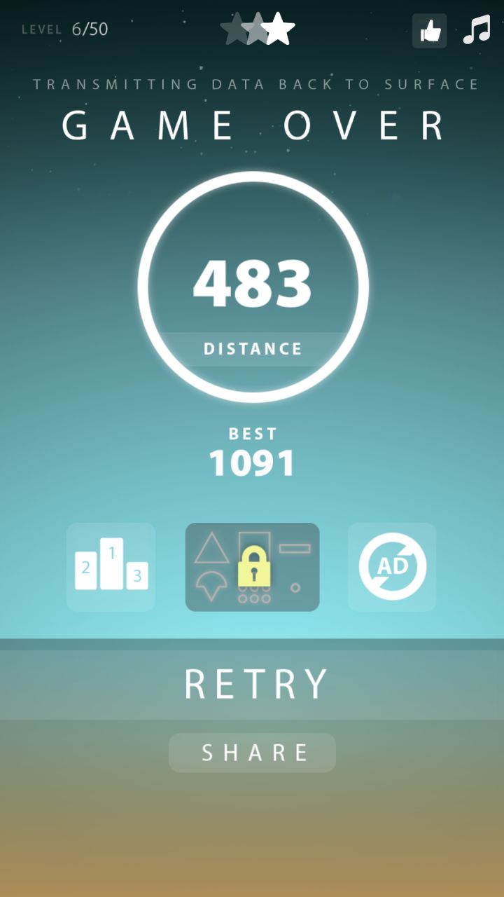 “容易学习,难于操作”是 AppStore 给《Force Escape》的一句话介绍,游戏的主界面似乎暗示了游戏的背景,一片废墟。此时世界应该已经只剩下一片虚无,那么我们保护在身后的,就把它当做“希望”吧。在《Force Escape》中,我们将作为“希望”的守护者,把它带离这已经坍塌的世界,“希望”勇往直前,我们则在它身前它披荆斩棘。逃生力场,逃离的就是这带有重力的地球。游戏有50种障碍挑