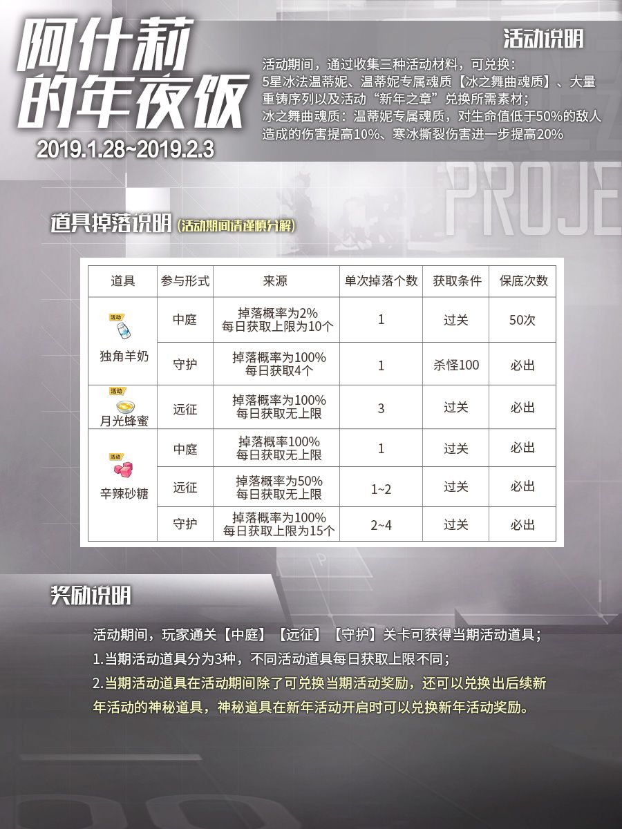 阿什莉的年夜饭 活动期间,玩家通关【中庭】【远征】和【守护】关卡可获得当期活动道具 注意!当期活动道具在活动期间除了可兑换当期活动奖励,还可以兑换出后续新年活动的神秘道具,神秘道具在新年活动开启时可以兑换新年活动奖励哦~ 回溯重构-限时卡池复刻 活动时间内,玩家在限时卡池进行构成有几率获得限定六星角色伊丽莎白、蒙克斯,与限定五星角色艾丽切莉、土御门雪奈,构成几率均比同品质角色高。 注意!特殊构成次
