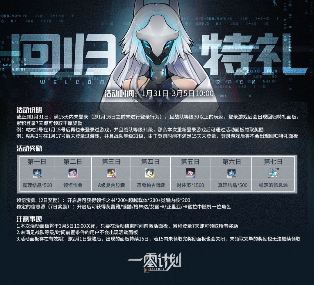 回归特礼 时间:1月31日~3月5日 截止到1月31日,满15天内未登录(即1月16日之前未进行登录行为),且战队等级30以上的玩家,登录游戏后会出现回归特礼面板,累积登录7天即可领取丰厚奖励!
