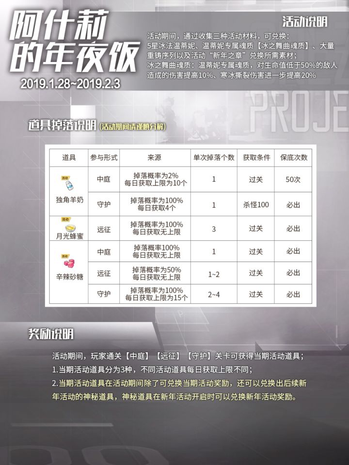 阿什莉的年夜饭活动期间,玩家通关【中庭】【远征】和【守护】关卡可获得当期活动道具注意!当期活动道具在活动期间除了可兑换当期活动奖励,还可以兑换出后续新年活动的神秘道具,神秘道具在新年活动开启时可以兑换新年活动奖励哦~回溯重构-限时卡池复刻活动时间内,玩家在限时卡池进行构成有几率获得限定六星角色伊丽莎白、蒙克斯,与限定五星角色艾丽切莉、土御门雪奈,构成几率均比同品质角色高。注意!特殊构成次
