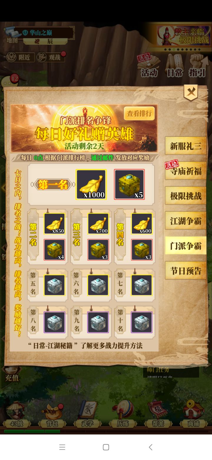 今天是风云再起4服开服的第五天,我玩游戏的第四天,给大家看看我们服十二门派战力最高的玩家战力情况不知道为什么少林被屏蔽了,第十名战力55000左右,属于冷门门派