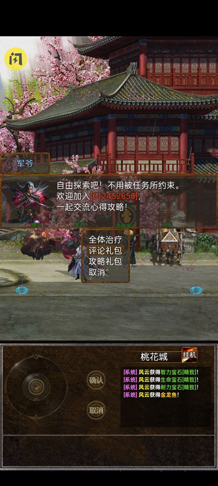 选择完职业进游戏后打开背包领取元宝 左转去找军爷领取更新奖励和宠物一只,领取码在群里有,之后购买元宝商店的鱼竿或者矿稿,装备上根据职业去挖矿或者钓鱼换取称号,气宗钓鱼,武者,刺客挖矿,挖矿钓鱼一直往后走即可看见,称号在军爷旁边npc换取。