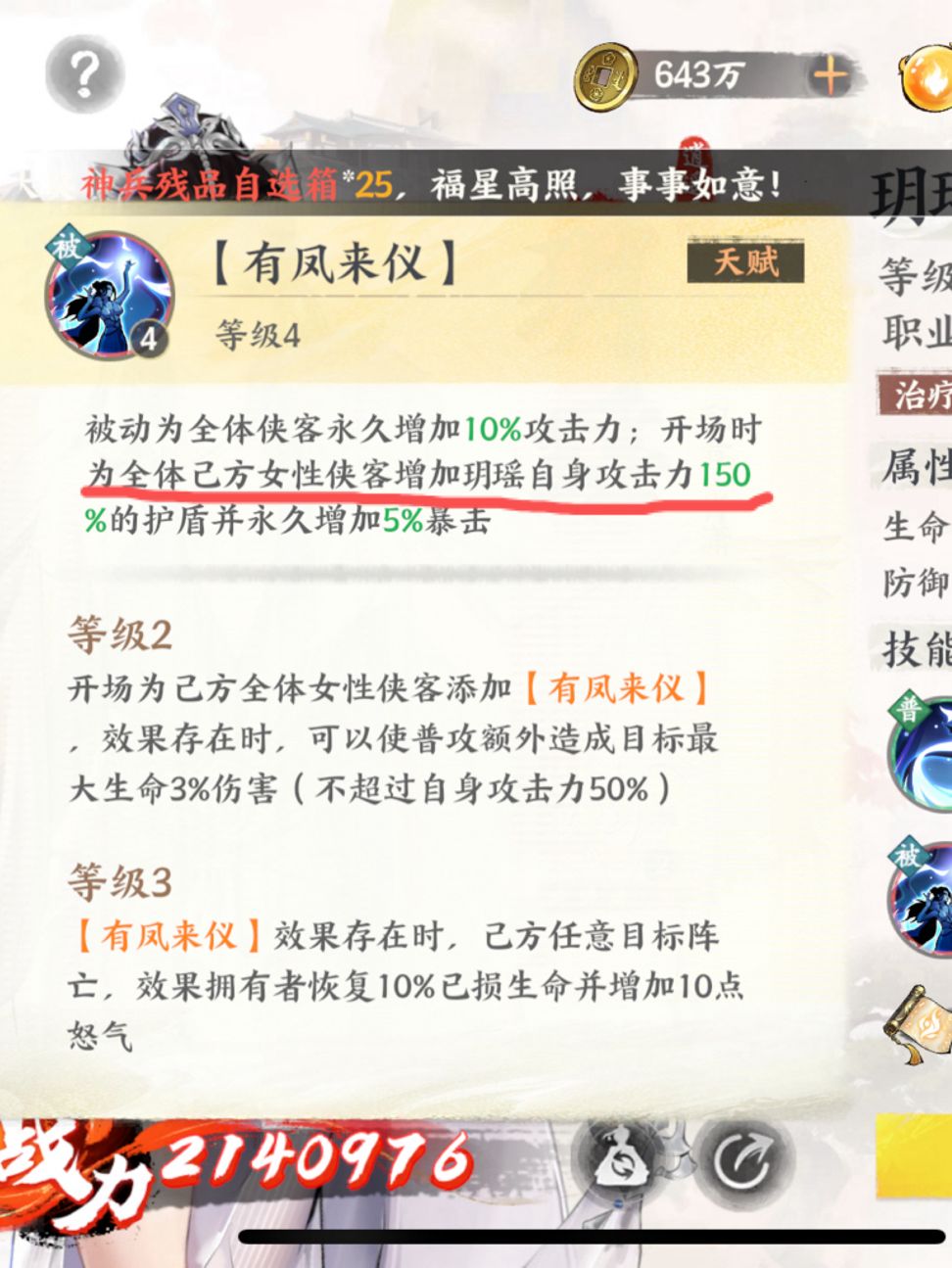 如图,容我攒满自选给雷子换条聚气,这个就算有2条半有用词条了,对了,高级属性和心法都可以重复,整它4条速度出来doge 加一句,自选是橙的,也就聚气还算凑合,其他和红的差挺多,聚气没加强前也是配合明德帝,现在刷个速度选个聚气也算自选有点用处了