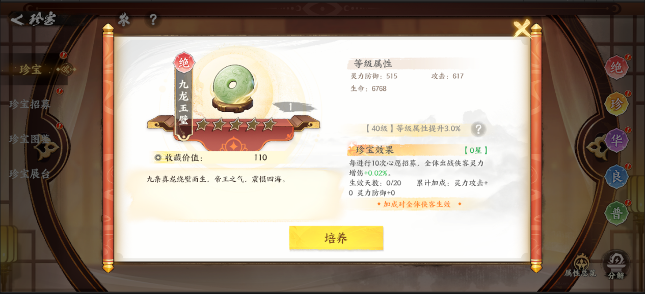各位侠士好,1月22日珍宝系统将迎来珍宝大版本。昨日首批珍宝的亮相,已让江湖初窥灵力玄机。今日,我们倾囊相授——剩余所有红色与橙色珍宝将一次性曝光,制胜先机尽在掌中! 【珍宝大版本爆料】第二弹 第二批珍宝爆料(截图为开发中内容,具体配置以游戏实际上线为准) 九龙玉璧孙子兵法和氏璧昆仑玉定海珠凤凰羽太阿剑炼妖壶九黎鼓推背图麒麟印神农鼎四海令太阳神鸟霓裳羽衣琥