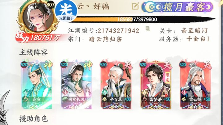 久违的记录贴,楼主在玩了两个月后终于是达到一亿战力。虽然依旧是个小菜,但也是值得纪念的节点。目前楼主阵容如图所示,走的是弱点流,但是由于红色心法玉只有一个(适合雷梦杀就没继续洗了),并且谢宣的神兵没有升星,导致实际战力非常弱,经常被越战,楼主也是很难过。接下来的目标就是继续合成红玉,洗点能用的心法,然后等下次神卡活动抽赵玉真的同时买谢宣的神兵,尽量拉个一星。至于最近出的新限定卡,楼主