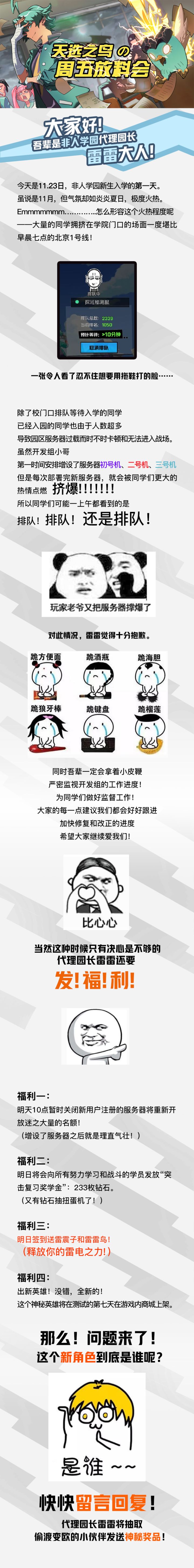 各位好!我是雷雷!今天的雷雷也给大家带来了新英雄的第一手设计资料,以及大家关心的几个英雄的设计脑洞哦~「研发手札」栏目,第三期继续!————————————————————————————「研发手札」:在没有测试的时候,非人学园开发组都在忙些什么呢?翻开研发手札,跟随雷雷一起去了解学园的施工进度吧!每周,研发手札都会围绕一个主题向各位介绍我们的世界观、英雄设计、特殊玩法以及隐藏在学园里的各种