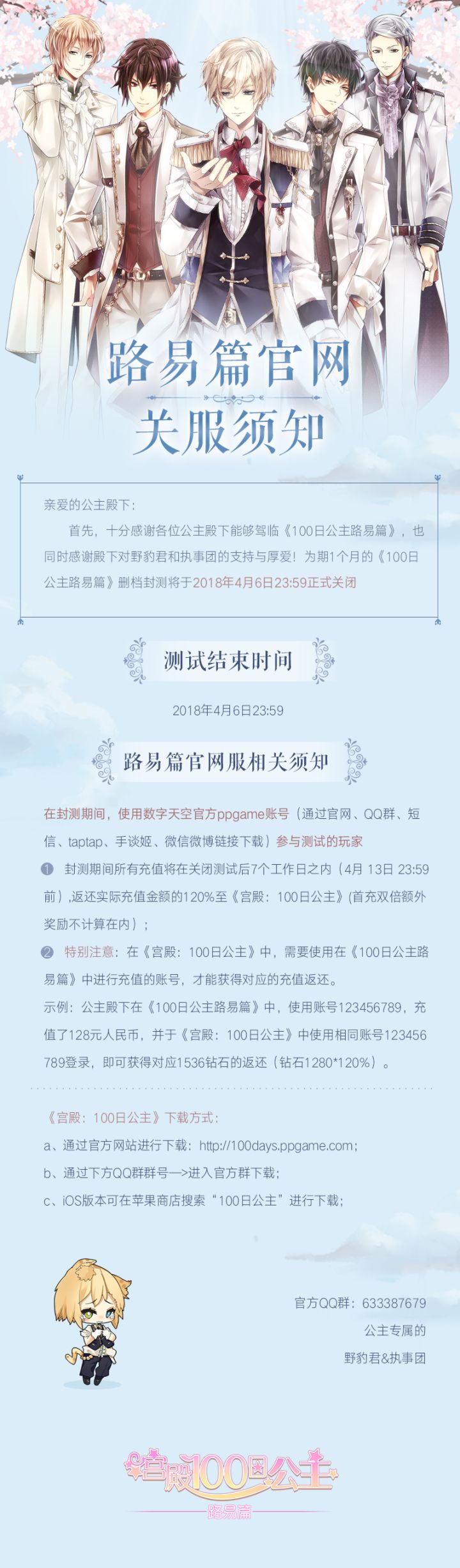 亲爱的公主殿下:野豹君在这里非常抱歉的通知各位公主殿下《100日公主-路易篇》即将与4月6日关闭本次测试,公主们可以《宫殿:100日公主》和王子们继续甜蜜的恋爱之旅哦已经在路易篇中充了值的公主殿下~我们将在7个工作日内将充值金额120%的返还在《宫殿:100日公主》游戏中哦!详细公告请公主殿下参阅下方长图❤~
