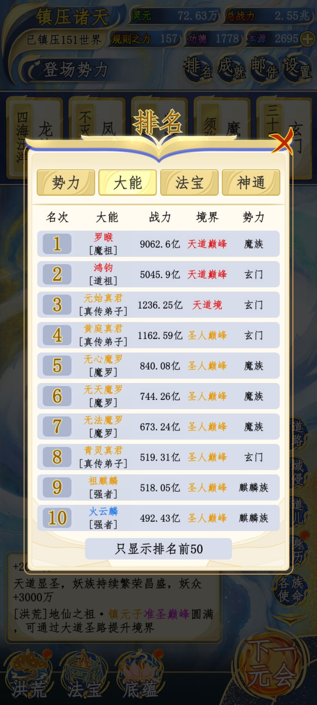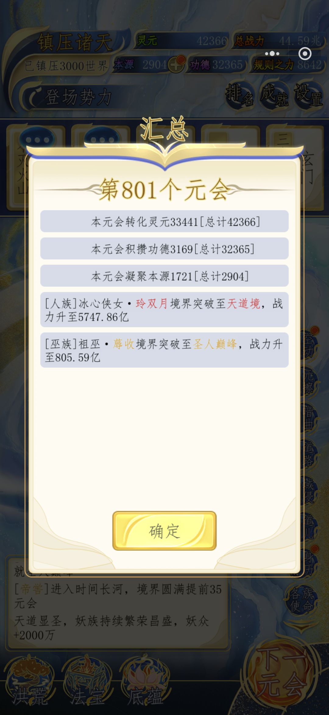 先叠个甲,防止有优越感玩家过来和我对线。毕竟数据好看的比比皆是。我是完全不看广告的,甚至签到都没点。也没有任何作弊。至于为什么,我待会再讲 说主观,这游戏没有最强种族,什么种族厉害全看玩家偏爱和资源倾斜。其次就是看种族潜力。因为我是人,所以我偏爱人族,再加上人族潜力也最大。 说正题,先说资源,所有资源都不怎么缺,本源重头到尾都缺,但也够用,最缺的就是鸿蒙紫气,这是限制境界也就是战力的最大问题,后面