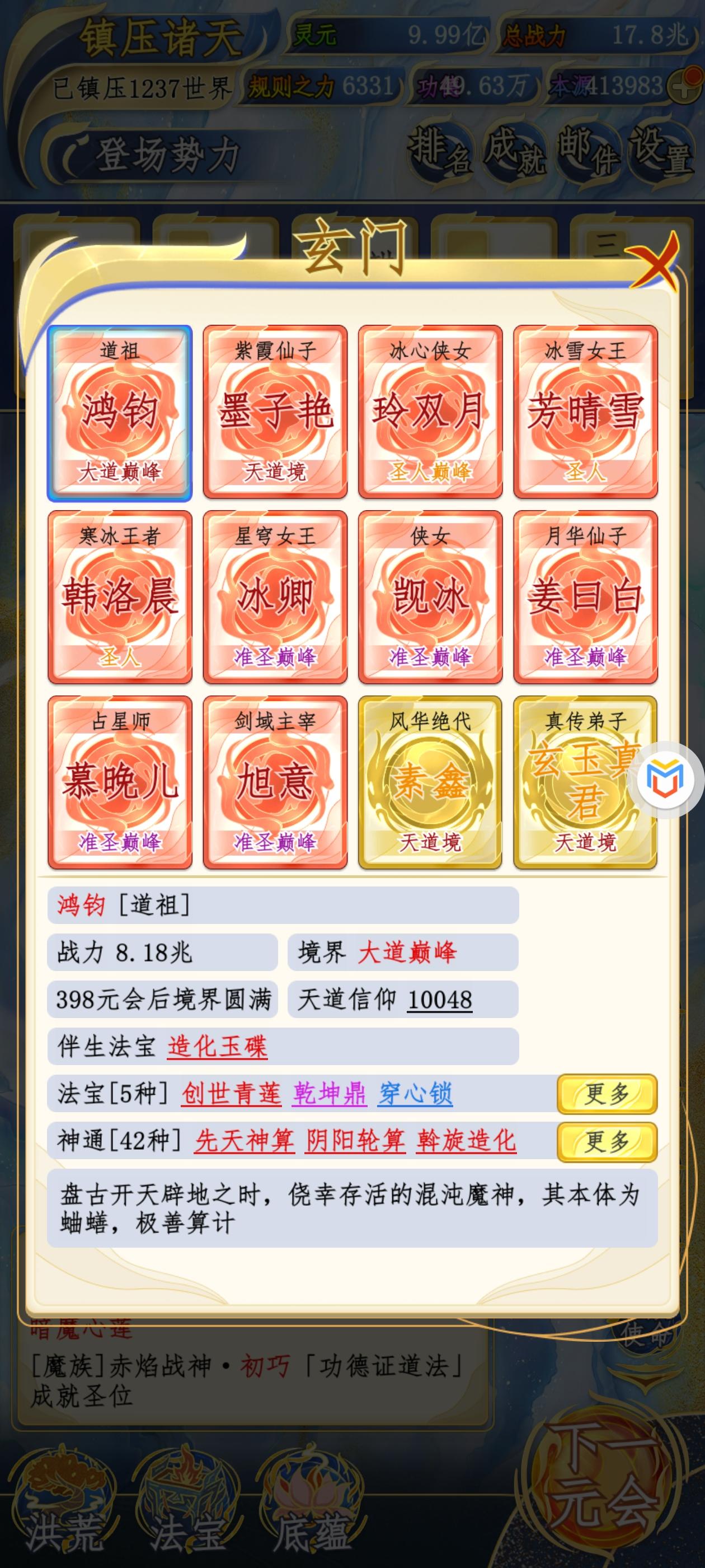先叠个甲,防止有优越感玩家过来和我对线。毕竟数据好看的比比皆是。我是完全不看广告的,甚至签到都没点。也没有任何作弊。至于为什么,我待会再讲说主观,这游戏没有最强种族,什么种族厉害全看玩家偏爱和资源倾斜。其次就是看种族潜力。因为我是人,所以我偏爱人族,再加上人族潜力也最大。说正题,先说资源,所有资源都不怎么缺,本源重头到尾都缺,但也够用,最缺的就是鸿蒙紫气,这是限制境界也就是战力的最大问题,后面
