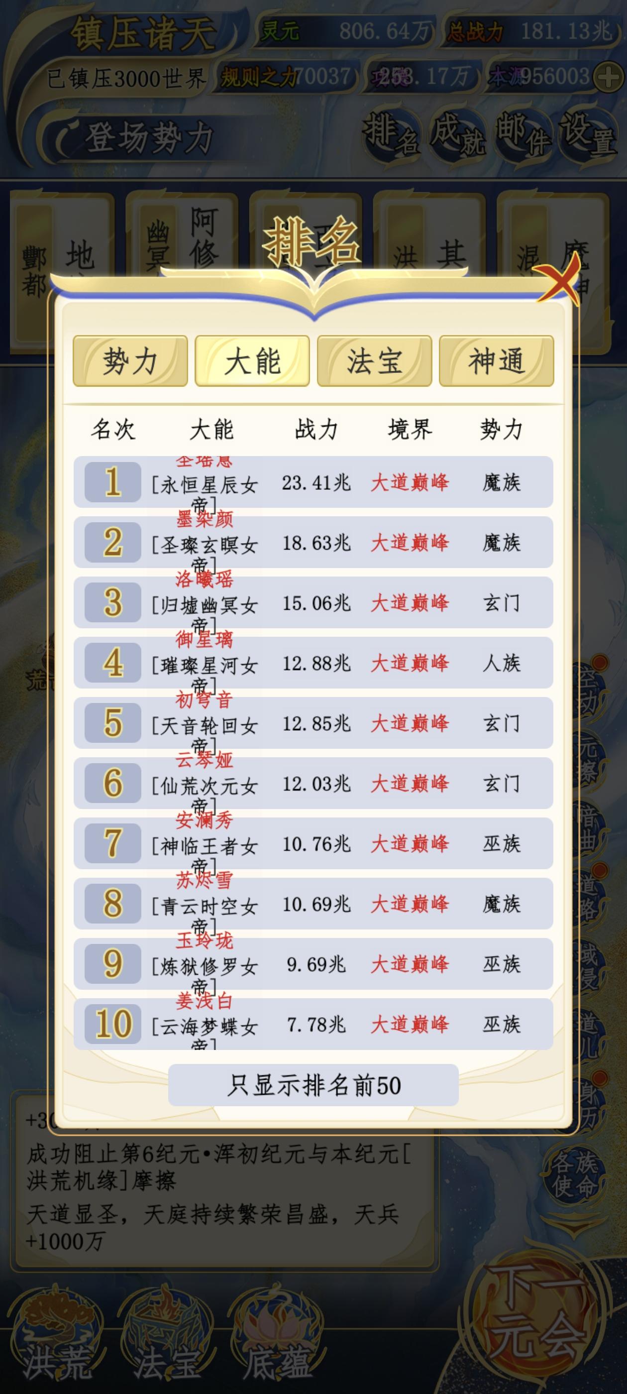 第一阶段龙族3人x34.5战力凤族4人x34.5战力麒麟4人x31.5战力魔族13人x 53.5战力玄门8人x41.5战力其他13人x61.5战力第二阶段巫族11人x39战力妖族5人x41.5战力最后阶段人族12人x41.5战力人教4人x28.5战力阐教18人x32.5战力截教9人x40.5战力天庭4人x38.5战力地府2人x34.5战力#洪荒天道2主宰 阿修罗9