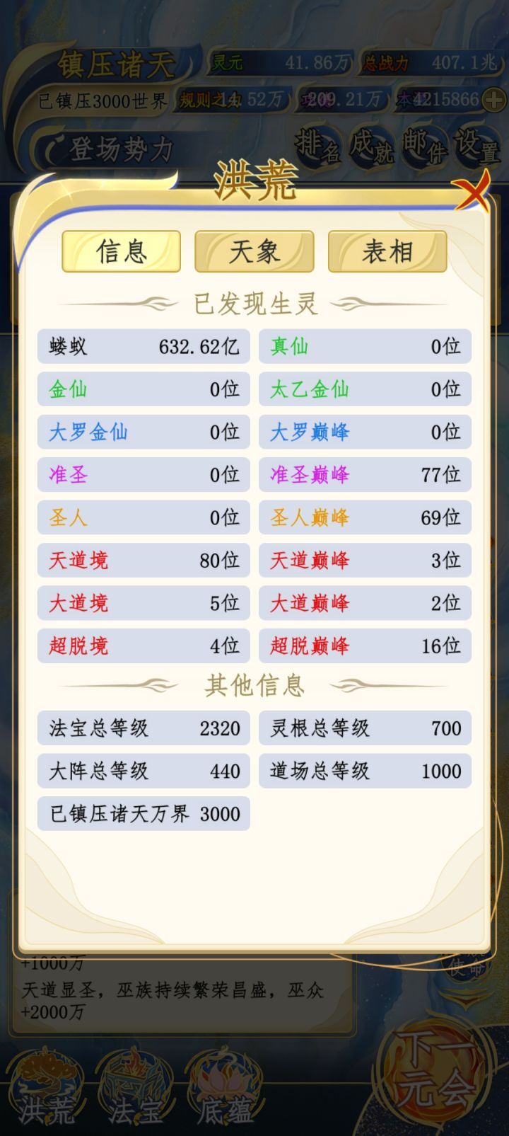 先叠个甲,防止有优越感玩家过来和我对线。毕竟数据好看的比比皆是。我是完全不看广告的,甚至签到都没点。也没有任何作弊。至于为什么,我待会再讲说主观,这游戏没有最强种族,什么种族厉害全看玩家偏爱和资源倾斜。其次就是看种族潜力。因为我是人,所以我偏爱人族,再加上人族潜力也最大。说正题,先说资源,所有资源都不怎么缺,本源重头到尾都缺,但也够用,最缺的就是鸿蒙紫气,这是限制境界也就是战力的最大问题,后面