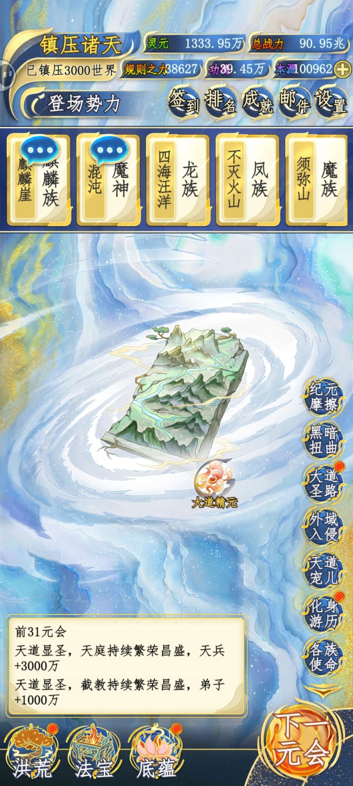 先叠个甲,防止有优越感玩家过来和我对线。毕竟数据好看的比比皆是。我是完全不看广告的,甚至签到都没点。也没有任何作弊。至于为什么,我待会再讲说主观,这游戏没有最强种族,什么种族厉害全看玩家偏爱和资源倾斜。其次就是看种族潜力。因为我是人,所以我偏爱人族,再加上人族潜力也最大。说正题,先说资源,所有资源都不怎么缺,本源重头到尾都缺,但也够用,最缺的就是鸿蒙紫气,这是限制境界也就是战力的最大问题,后面