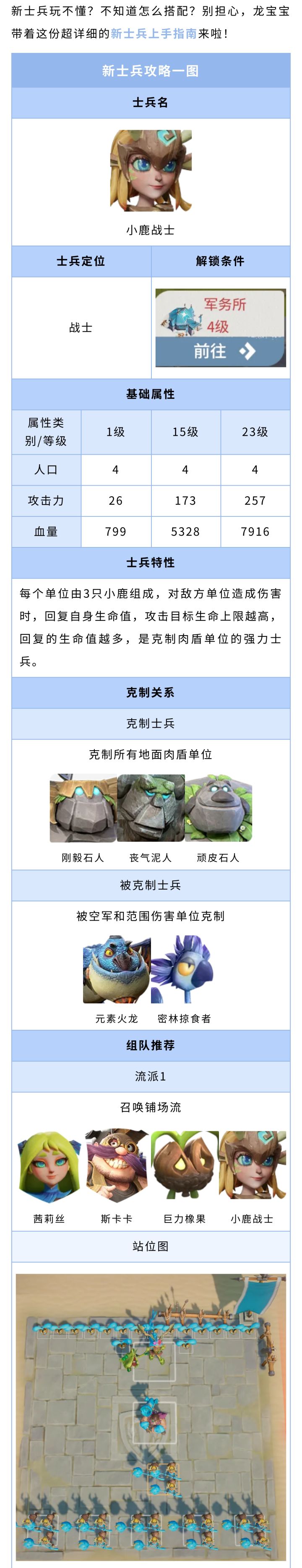 Hello 各位领主大人们好呀,这里是龙石攻略组~S2的新兵种秃子最近尝试了一下,感觉还不错。今天秃子给兄弟们带来一期新S2的新兵种实用性队伍。1小鹿战士简单说来说打肉+召唤流的铺场流派好用,克制前排的石诺+斯卡卡+塞纳金等一系列召唤流肉前排,以及泥人+石人肉前排兵种这里推荐配队如下召唤铺场流这里石诺可以稍微克制下近战前排(也可以替换为斯卡卡)打石诺+西蒙。或者纯的召唤流前排队伍都非常