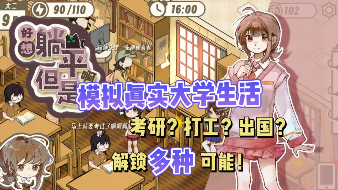 我们的大学校园模拟养成游戏《好想躺平啊,但是》现在开放steam Playtest测试啦!!我们是一款真实的大学生活模拟游戏!你将扮演一名平凡的大学生,在大学生活里进行各种养成,培养自己的结局。你可以在游戏里进行学习、社交 、锻炼、打工、恋爱等等活动!体验丰富有趣的大学生活可以在早八课堂上摸鱼玩手机,还可以直接翘课(不过概率会被老师抓到)可以在社团学习各种才艺技能,与社团的朋友进行社交,