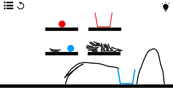 废话不多说,直接进入主题第一步先把蓝色的桶推下去,注意别让桶扣地上了,所以在最右边做一个架子,然后(如上图)画个坡就可以让蓝色球球进去了。第二步像第一步一样,把红色的桶推下去,如果觉得桶会扣住的话可以把左边那个架子稍微做一下调整,然后(如上图)画一个坡,就ok啦!ps:注意一下画坡的时候,一定要想一下球的大小,小的话容易卡主。还有就是,推球的时候要小心,要不然………………(ノДT)要不